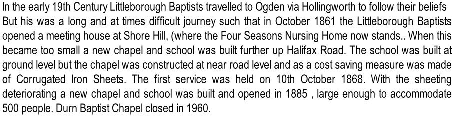 The Littleborough Area has a long history of non-conformist worship being blessed with around 20 chapels of which only four remain as places of worship with five still extant in use as houses and one as a hairdressers. The remainder have now been demolished to be replaced by housing, a nursing home or left as green spaces. The Society’s collection numerous booklets recalling key anniversary services, bazaars or other social and religious event as well as photographic remainders of their existence. This page covers those chapels in in Littleborough and Durn