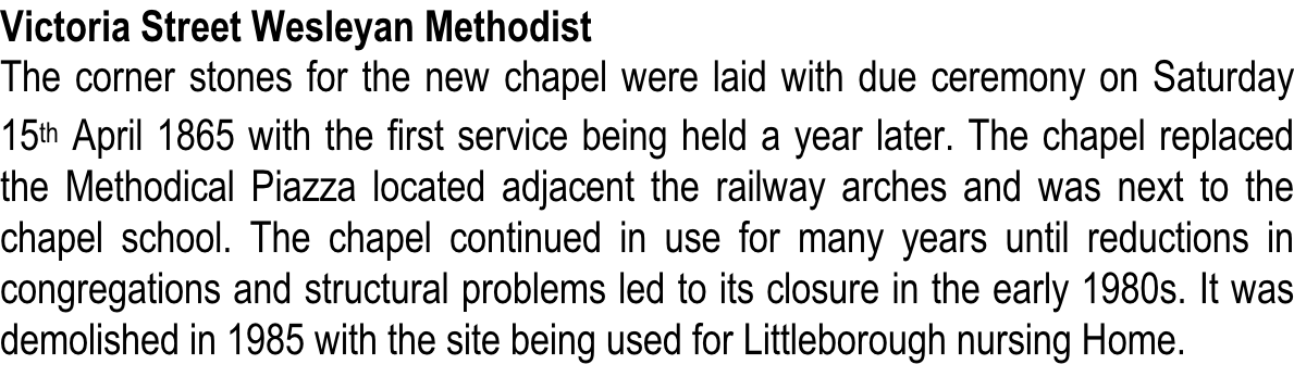 The Methodical Piazza was built 1805, the first such building in Littleborough. When the railway viaduct was built the chapel was accessed by a small bridge over the River Roch. However, noise from the trains meant services were increasingly disturbed and the Chapel closed in 1851. The new chapel was in Victoria St and is shown next